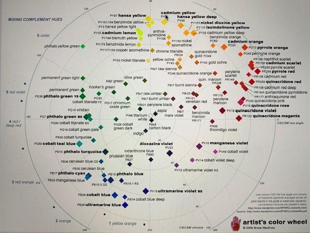 handprint.com color wheel – where common pigments are located on color wheel.