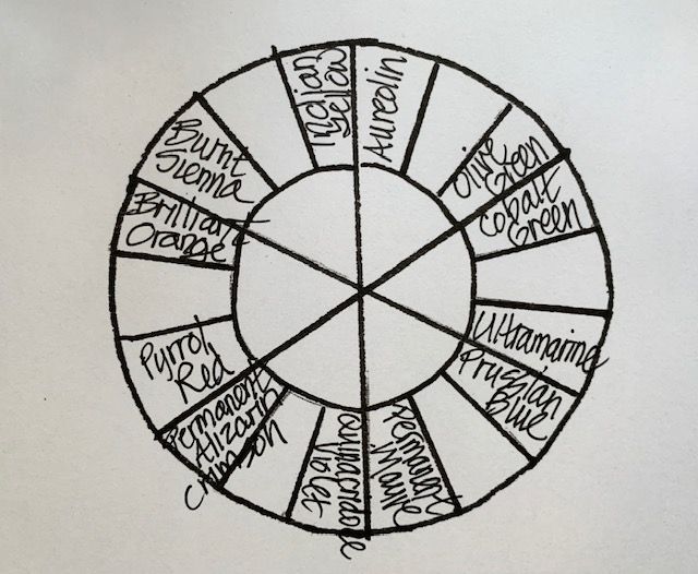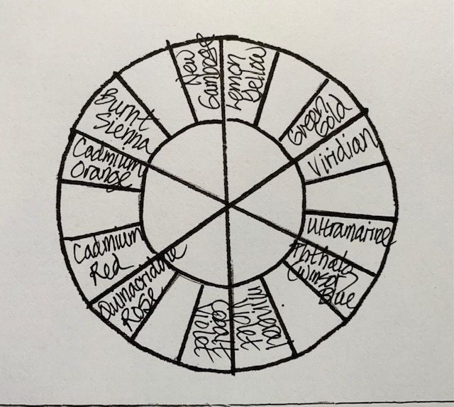 This will give you TWELVE colors – a good beginning – to space around your color wheel palette. Depending on the number of wells available in your palette, you can add or adjust your colors. Feel free to leave some spaces empty initially if you have a large palette. Or perhaps add an earth color for convenience.